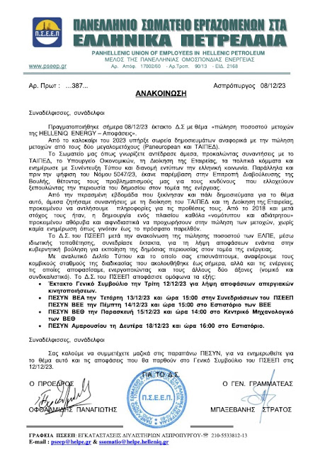 Πραγματοποιήθηκε σήμερα 08/12/23 έκτακτο Δ.Σ με θέμα «πώληση ποσοστού μετοχών της HELLENiQ ENERGY – Αποφάσεις».